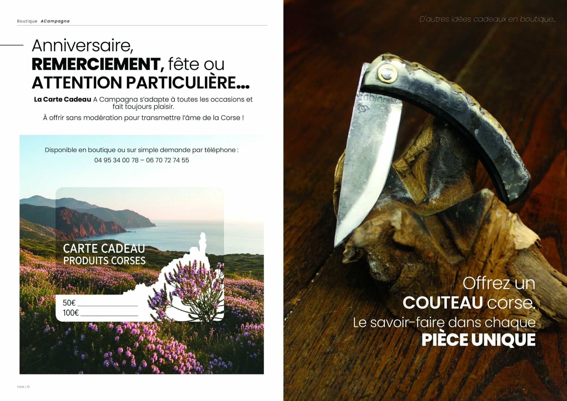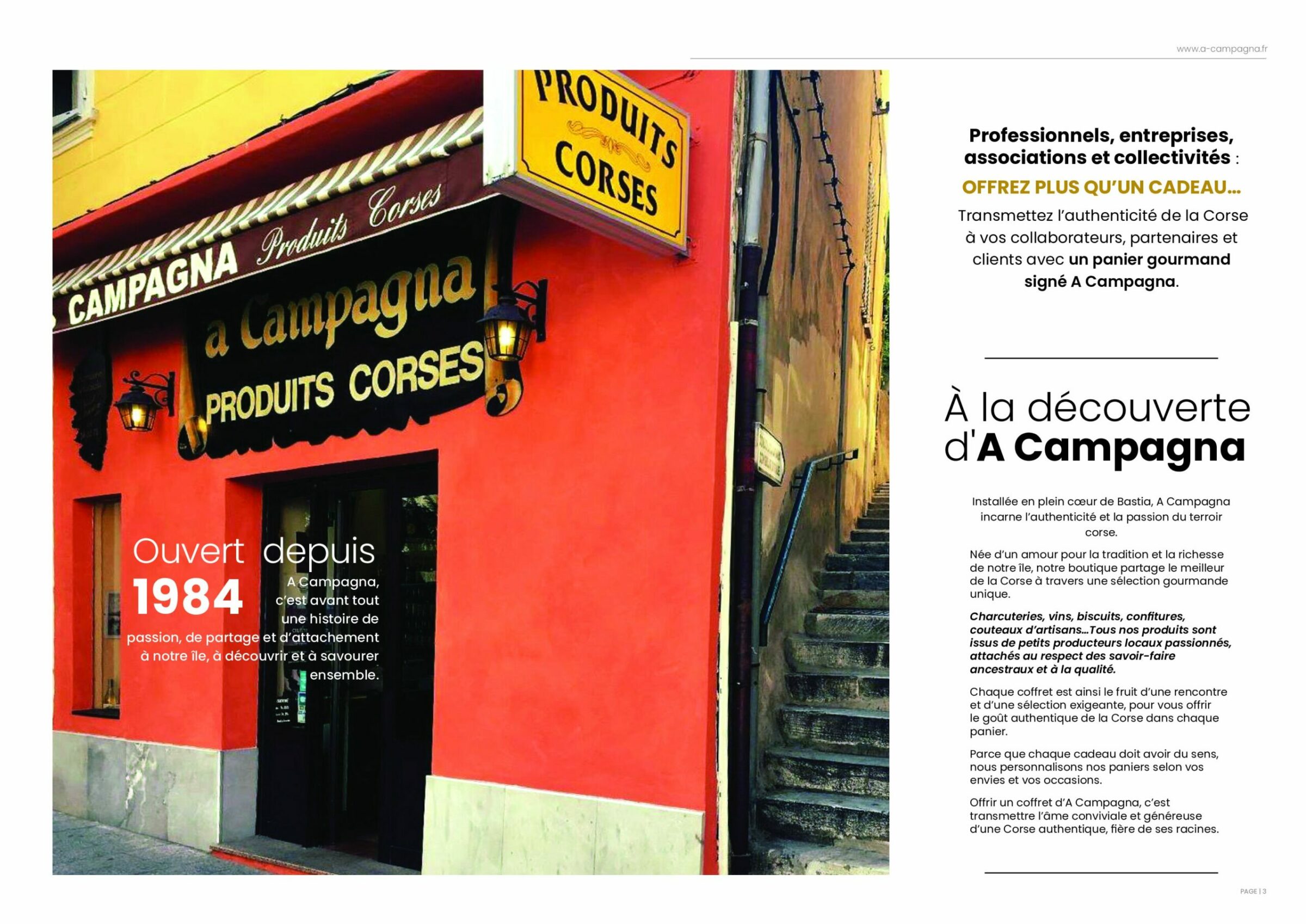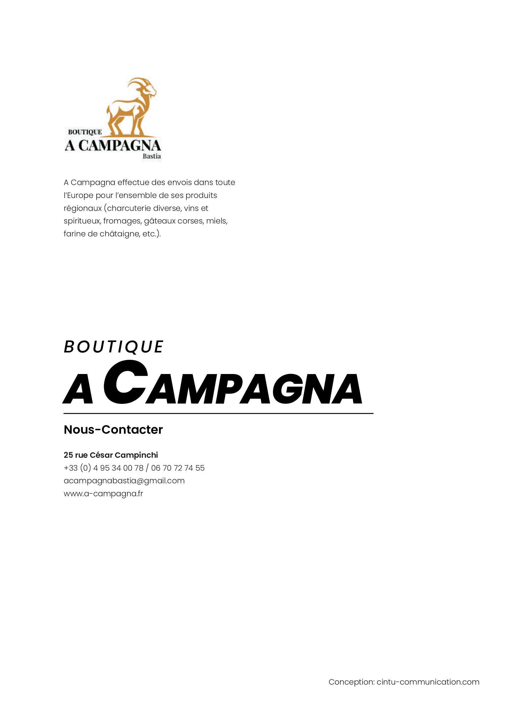 Installée au cœur de Bastia depuis, A Campagna partage l’âme conviviale et généreuse de notre île à travers des coffrets gourmands uniques. Charcuteries, vins, biscuits, confitures, miels, huiles d’olive… chaque produit est choisi avec soin auprès d’artisans locaux, dans le respect des savoir-faire ancestraux.